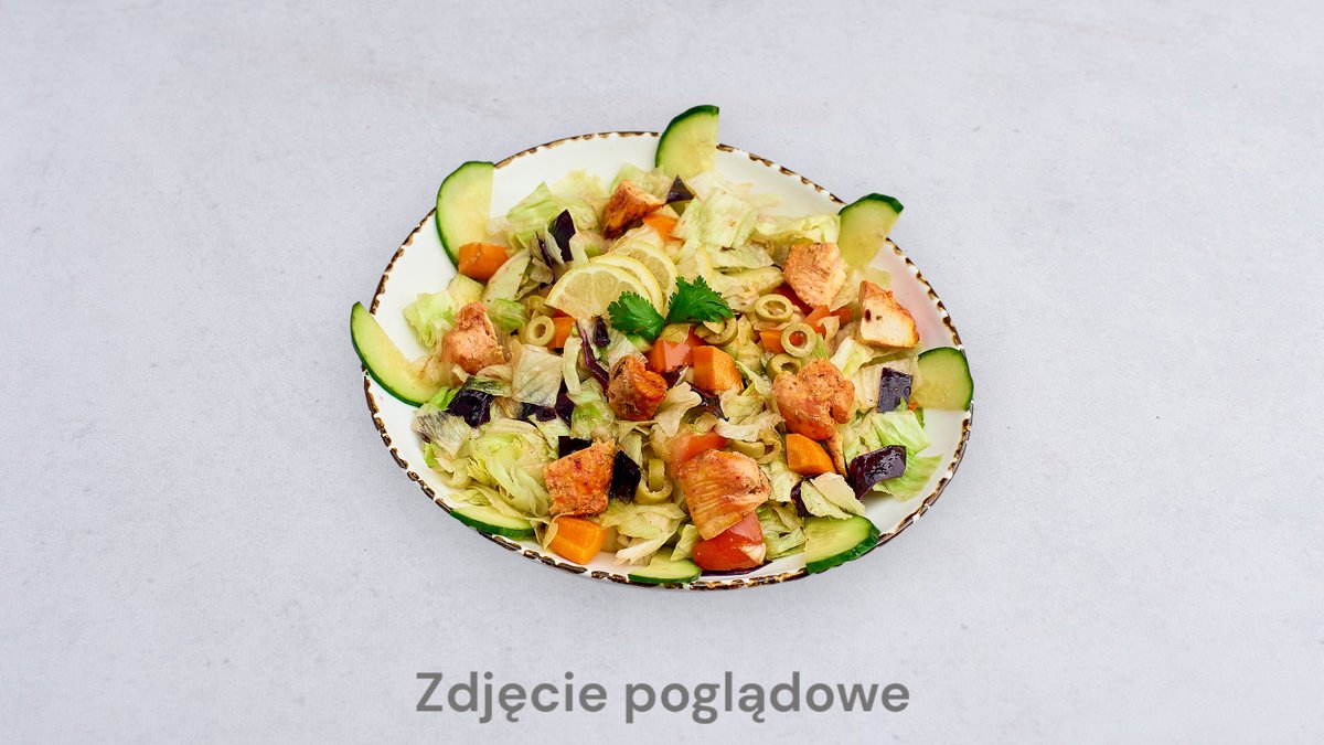 Cienkie plastry mango z kawałkami kurczaka tikka w połączeniu z świeżą sałatą, czerwoną cebulą i ogórkiem