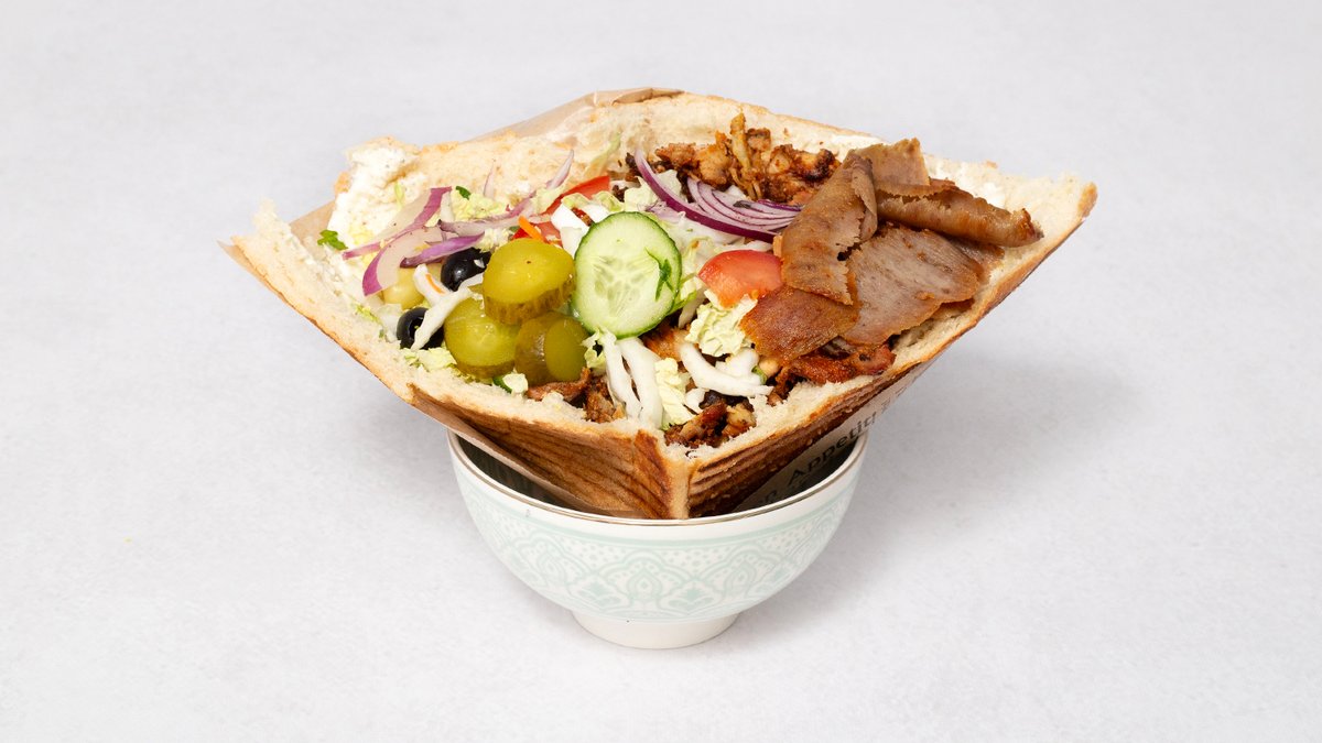 Humus, falafel, pekinska i lodowa, pomidor, ogórek, cebula, czerwona kapusta, sos do wyboru