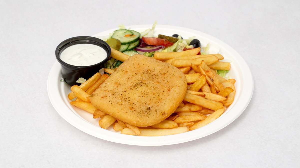 Panierowany ser, frytki lub ryż, mix warzyw, sos