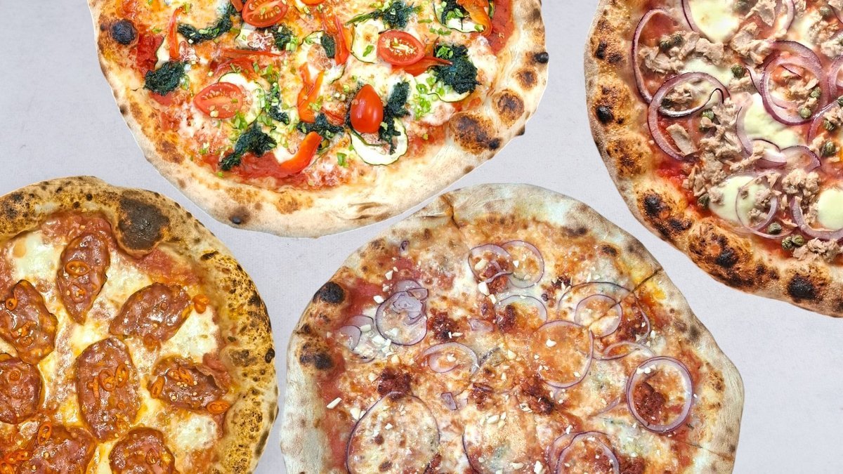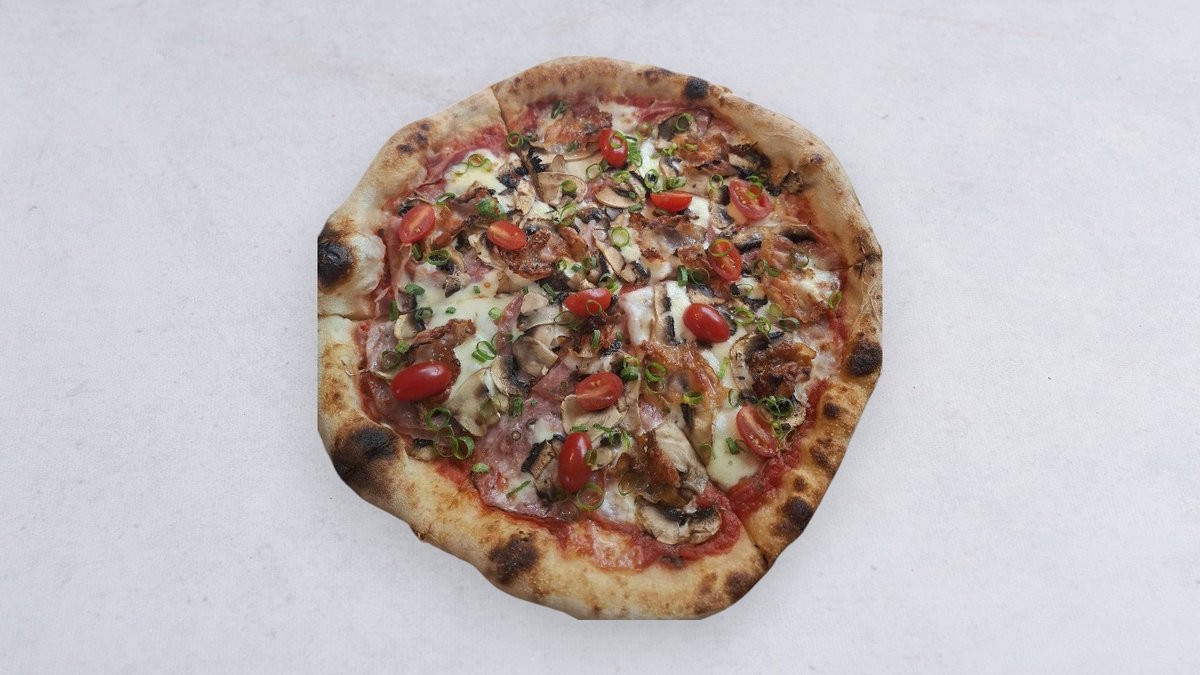 Sos pomidorowy, mozzarella, szynka cotto, salami napoli, guanciale, pieczarki, szczypiorek, pomidorki koktajlowe, oliwa