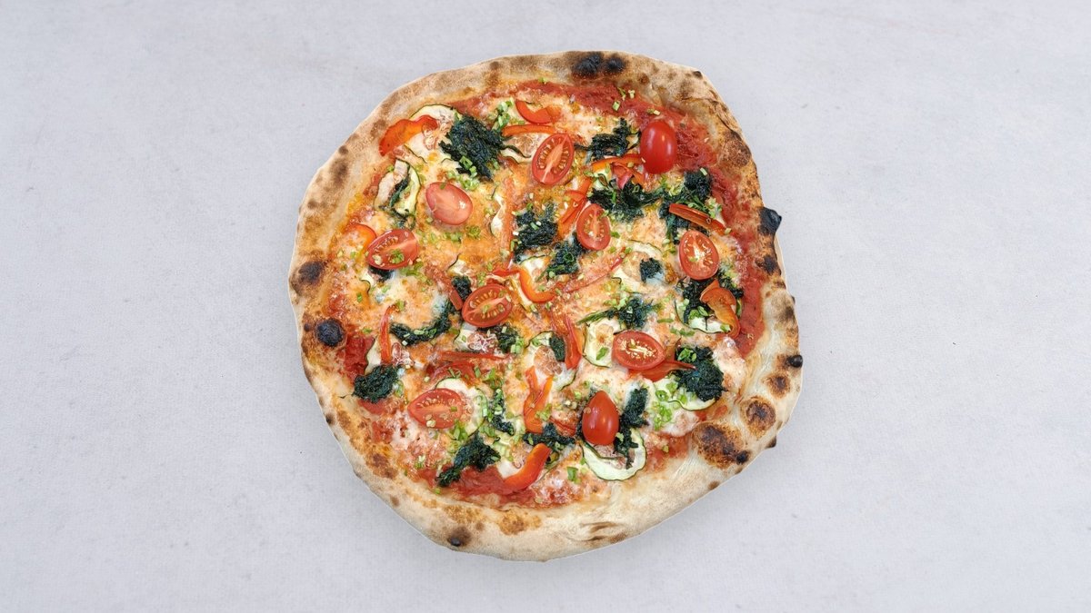 Sos pomidorowy, mozzarella, pomidorki koktajlowe, szpinak, czosnek, cukinia, szczypiorek, oliwa