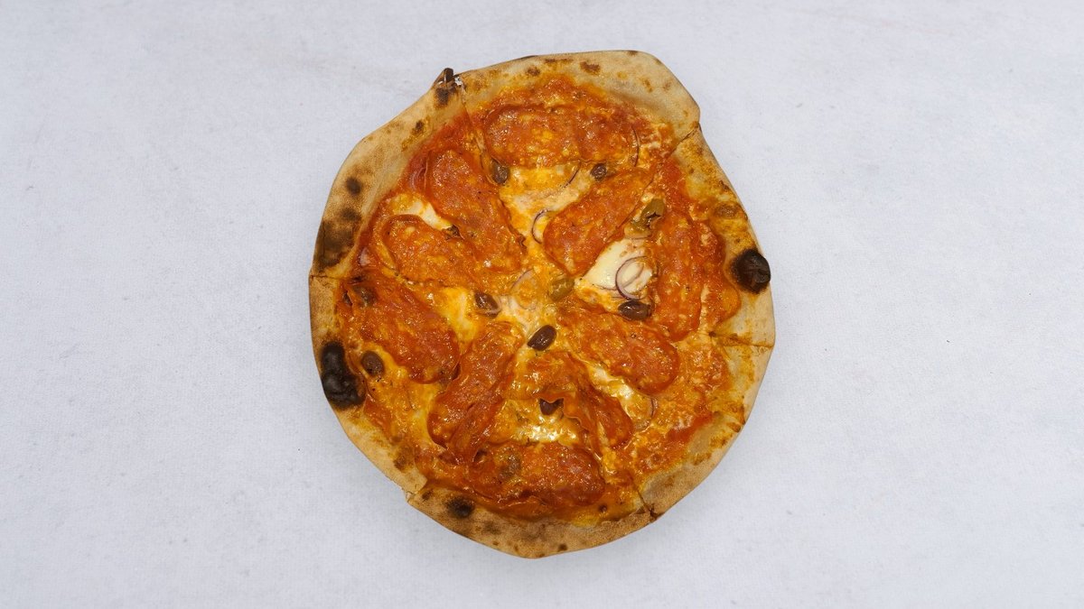Sos pomidorowy, mozzarella, scamorza, spianata piccante, oliwki, cebula czerwona, oliwa
