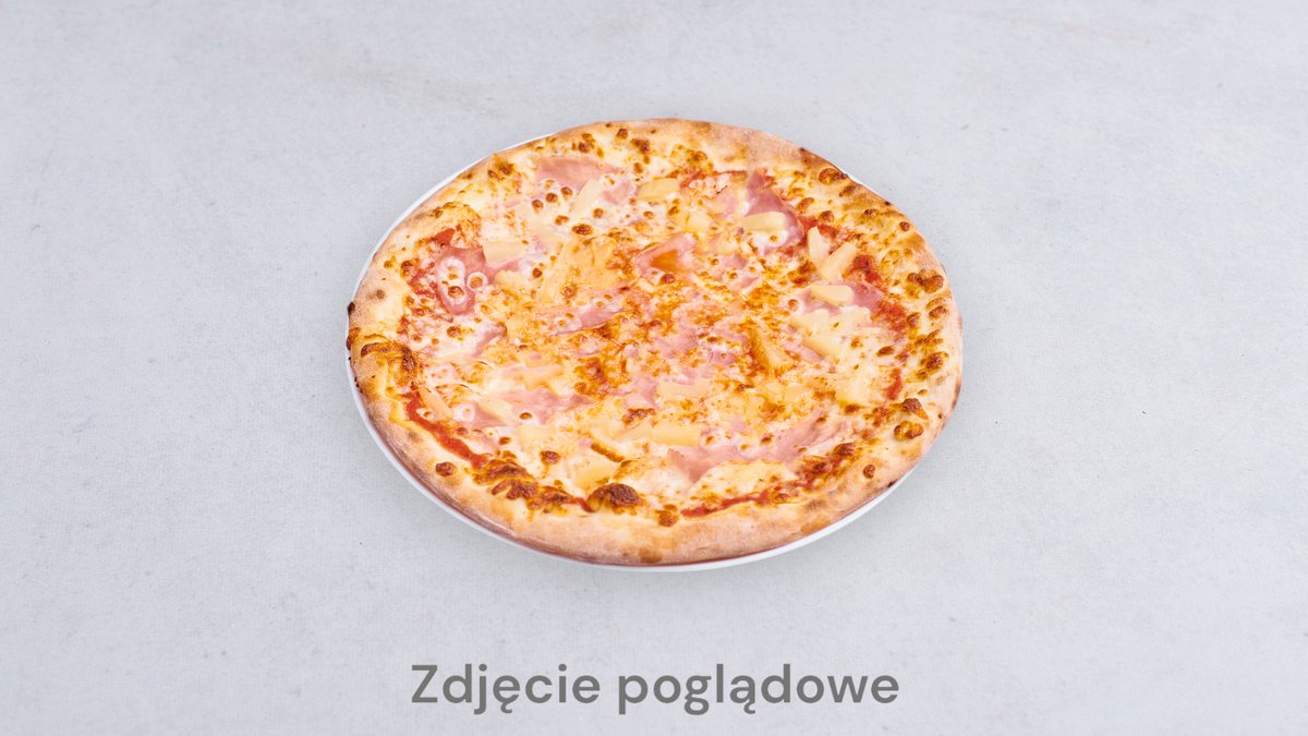 Sos pomidorowy, mozzarella, szynka cotto, ananas, oliwa