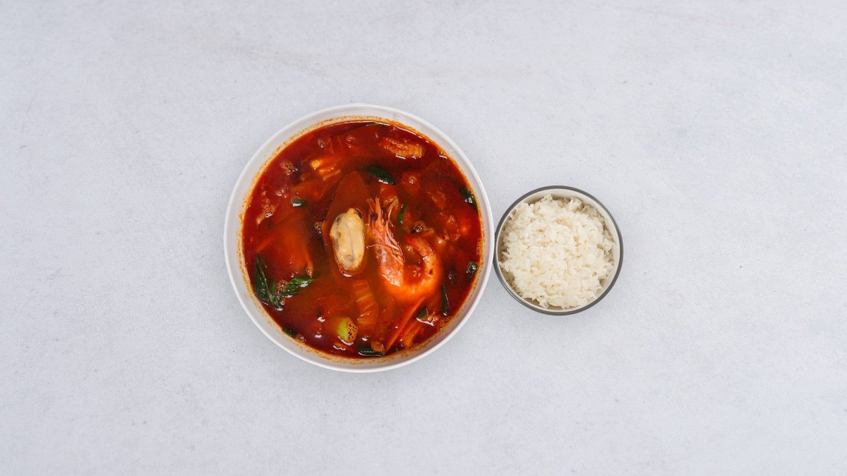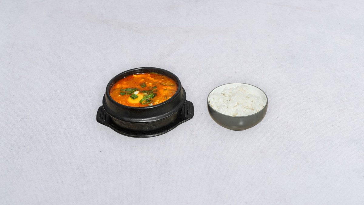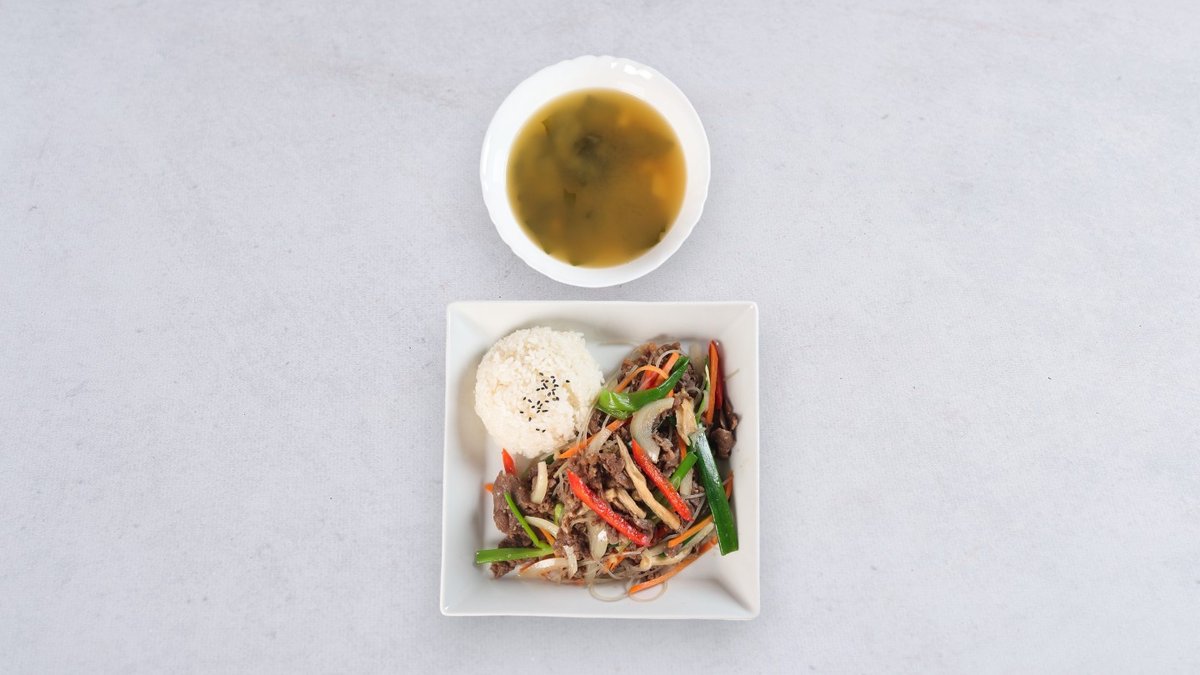 Ryż z wołowiną, różnymi warzywami i jajkiem sadzonym przeznaczony do spożycia przez zmieszanie wszystkiego z sosem goczudżang, do tego dania dołączona jest zupa