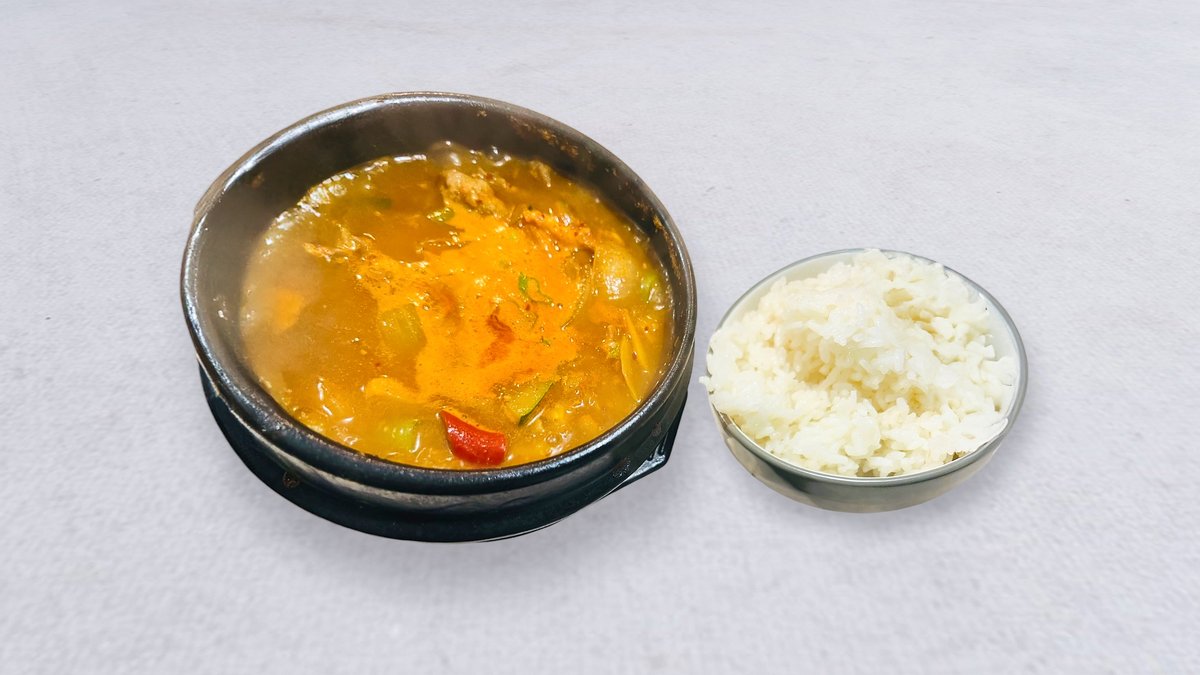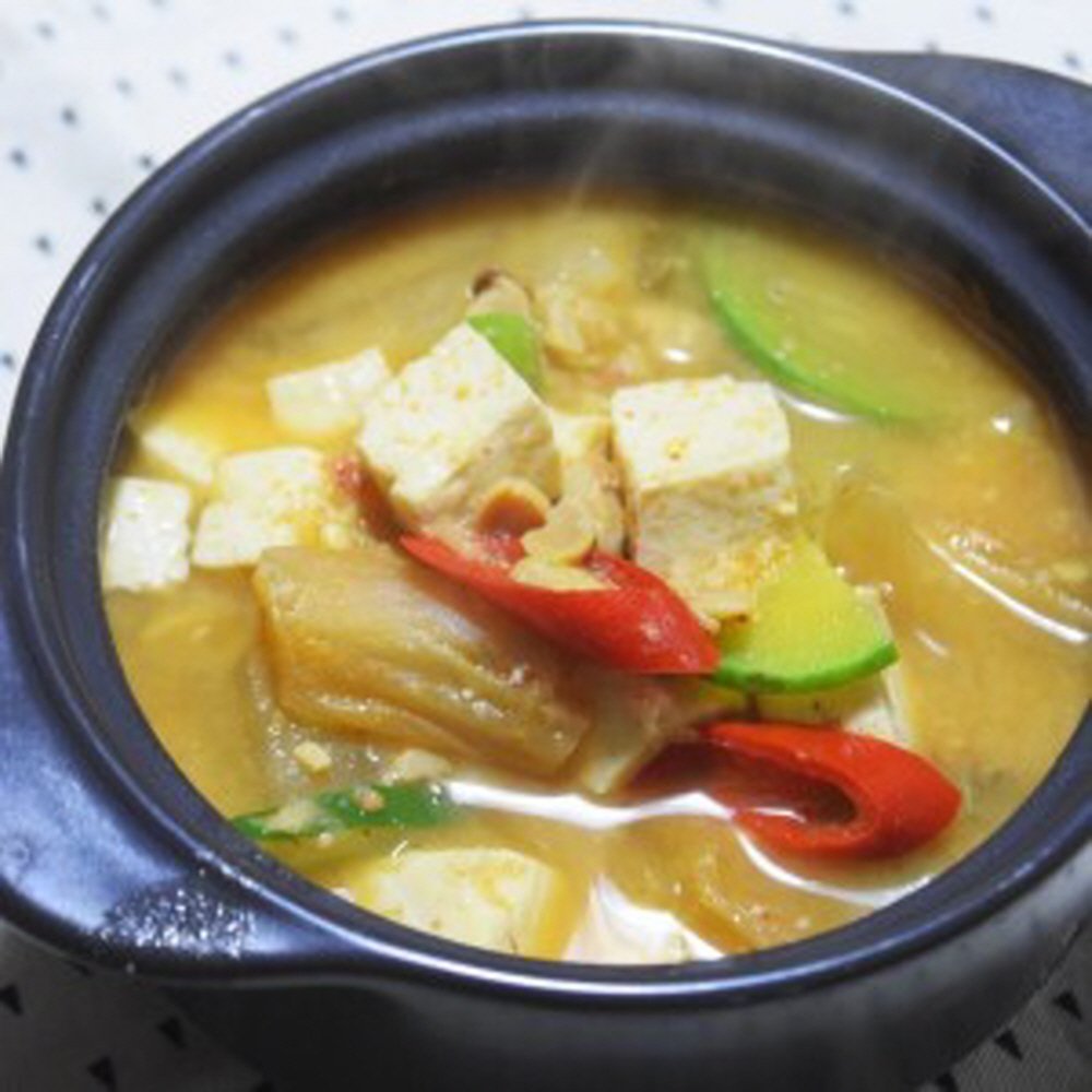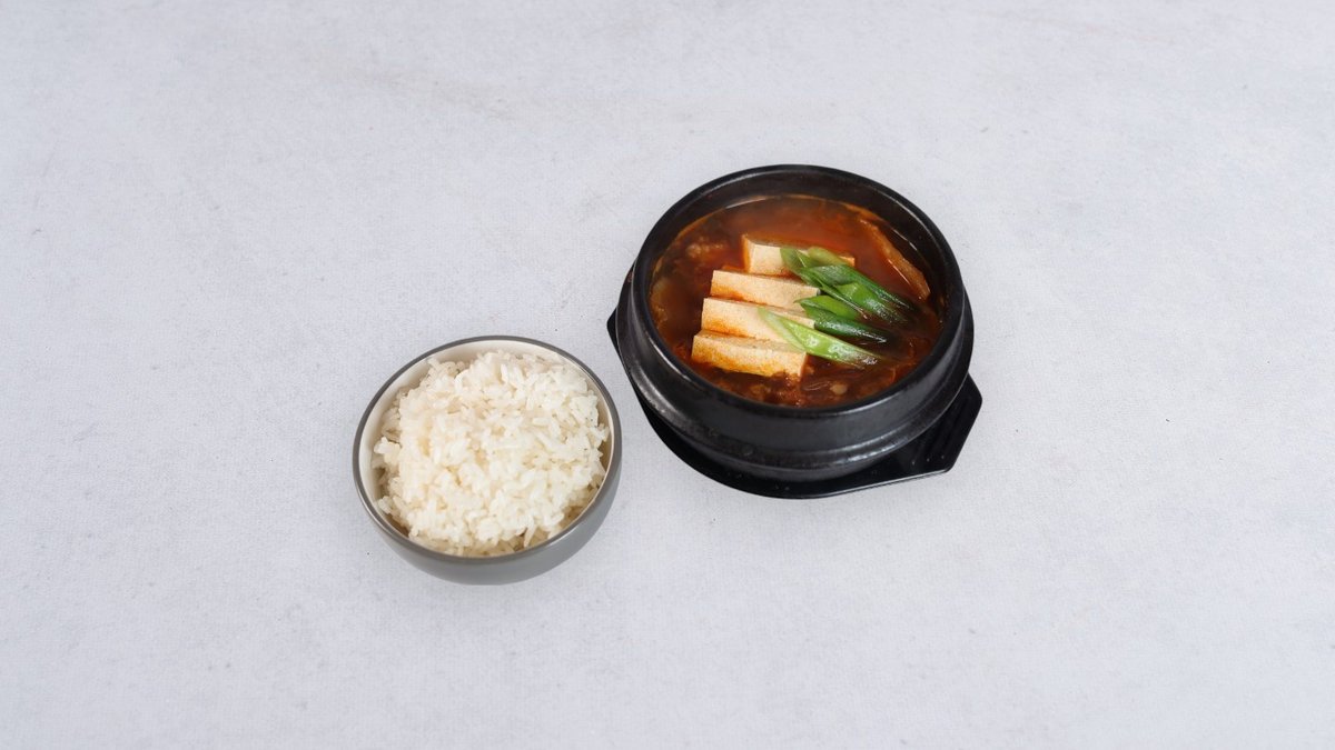 Rich soybean paste soup with tofu, vegetables and beef brisket. serve with rice Bogata zupa z pasty sojowej z tofu, warzywami i wołowiną. Podawać z ryżem