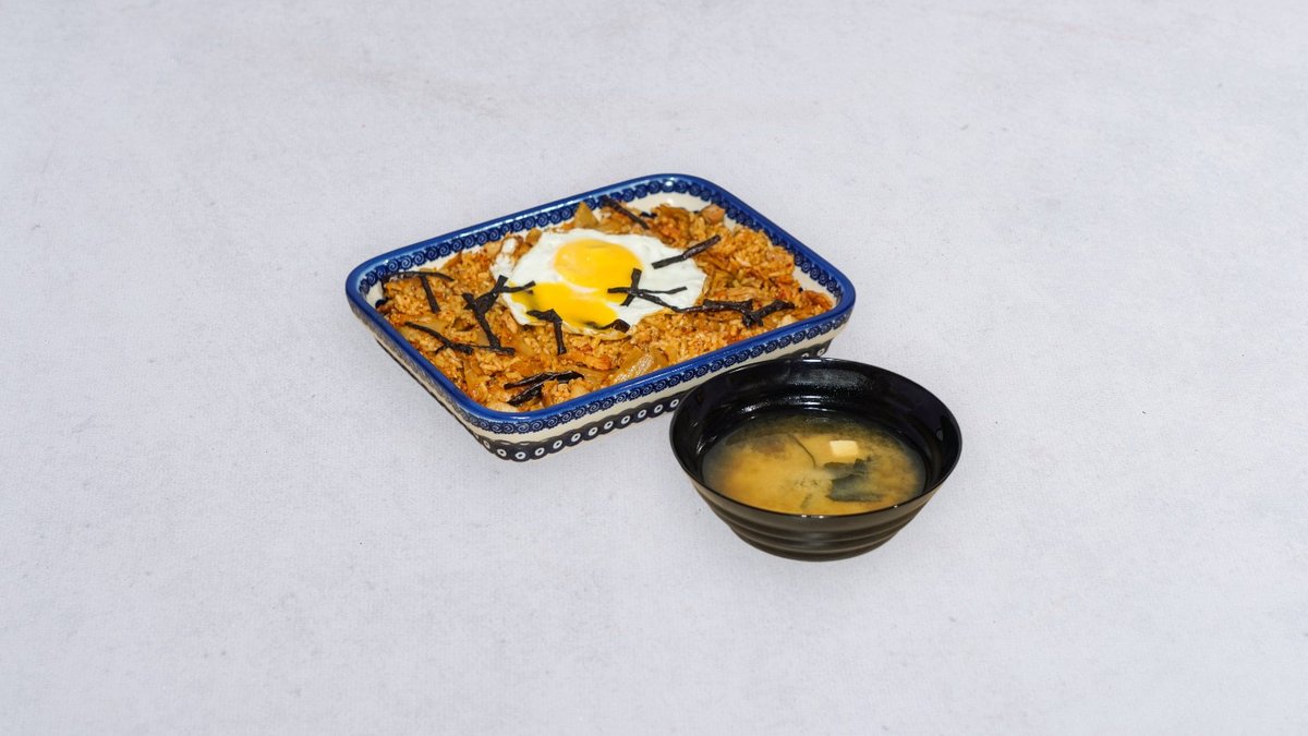 Smażony ryż z kimchi i boczkiem, podawany z jajkiem sadzonym i zupą