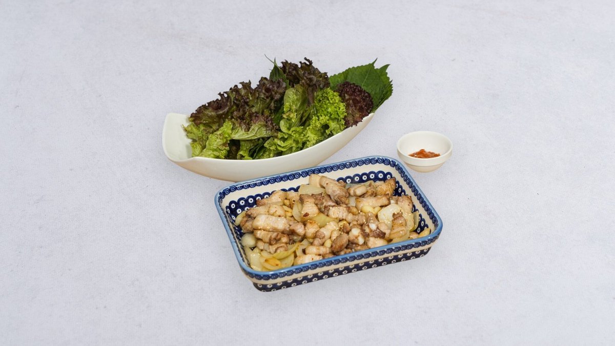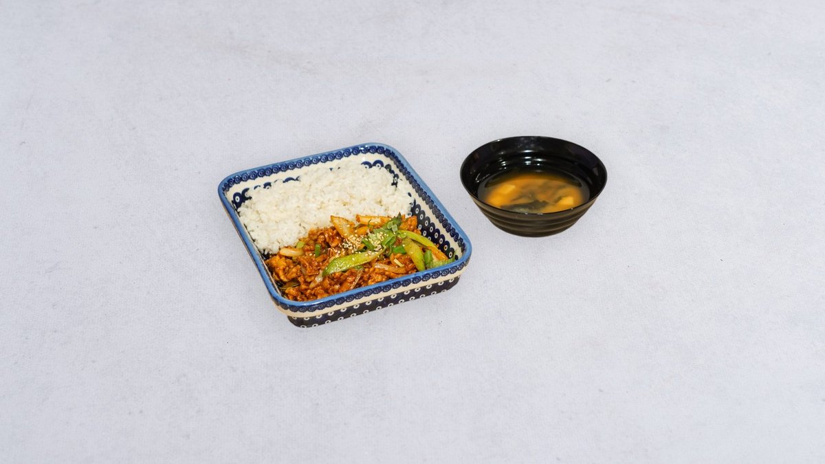 Smażony boczek z warzywami w półsłodko-pikantnym sosie goczudżang podawany z zupą
