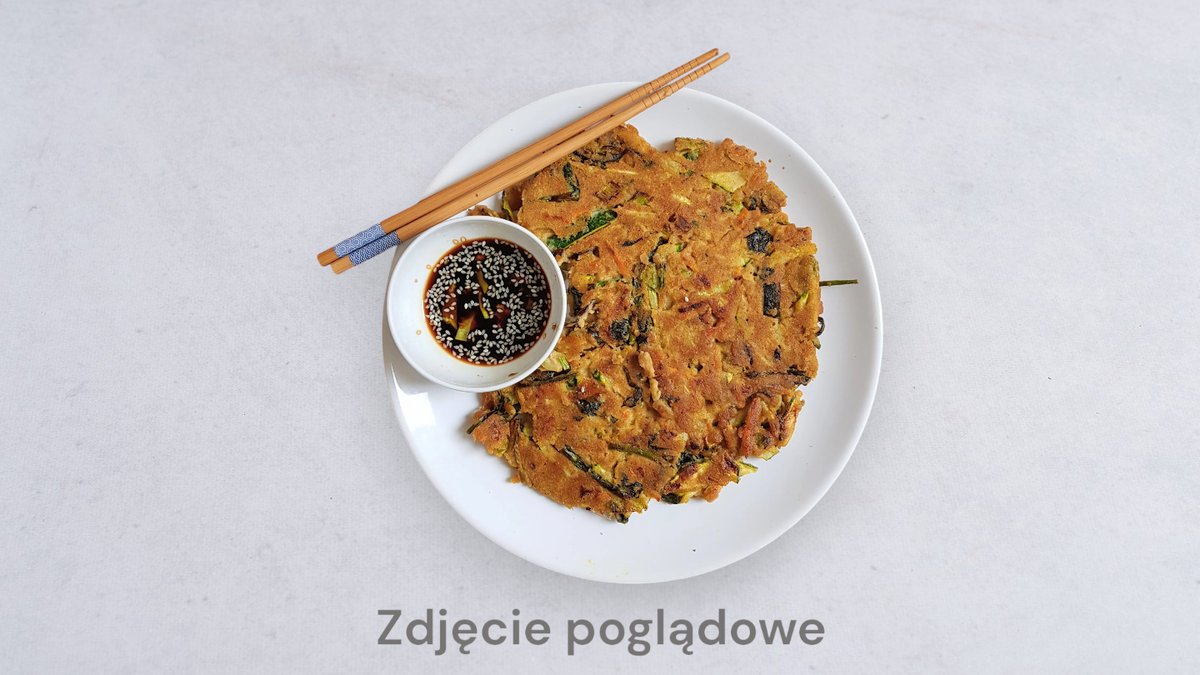 Pikantny placek z szalotką i owocami morza z sosem na bazie sosu sojowego