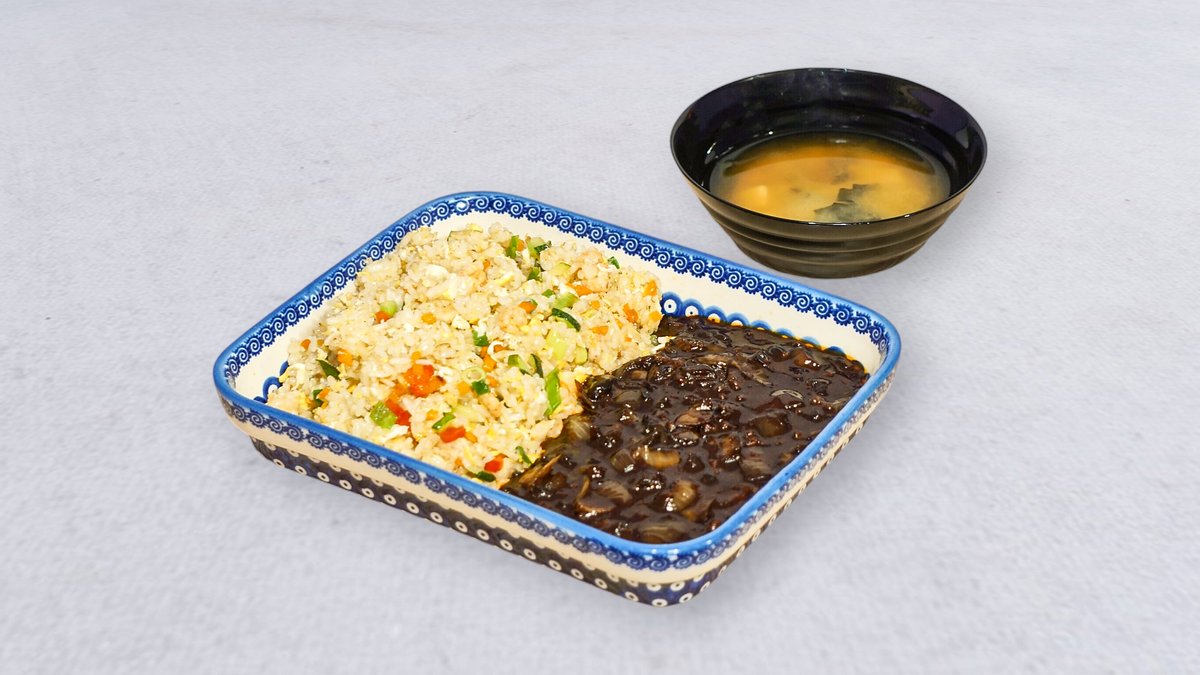 Smażony ryż z krewetkami i warzywami podawany z koreańskim sosem czadżang (z czarnej fasoli) z zupą