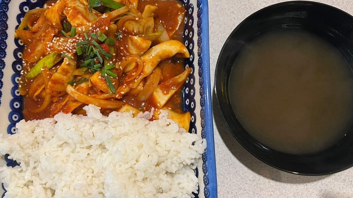 오징어덮밥 Ojing-o deopbab. Ostre kalmary