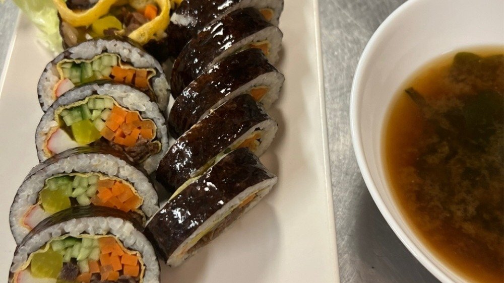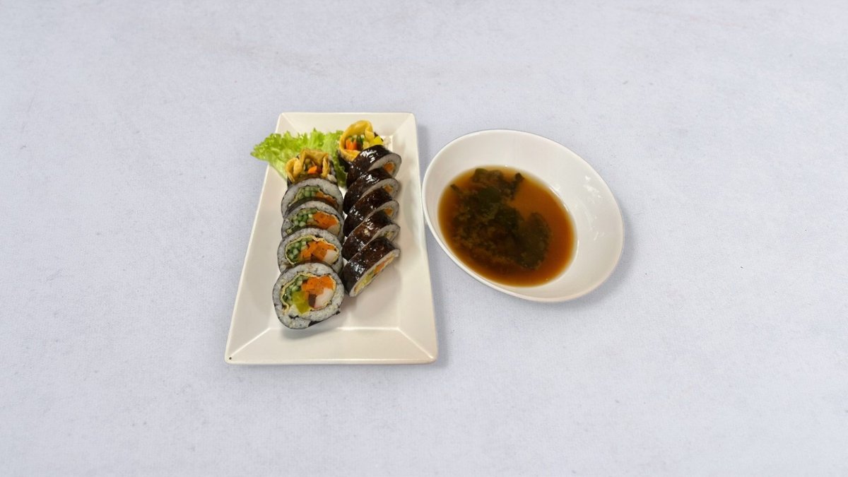Kimbap to koreańskie danie z gotowanego ryżu, różnych rodzajów warzyw, szynki, surimi, zawiniętych w gim – suszone arkusze wodorostów – i podawanych w postaci małych plastrów.
