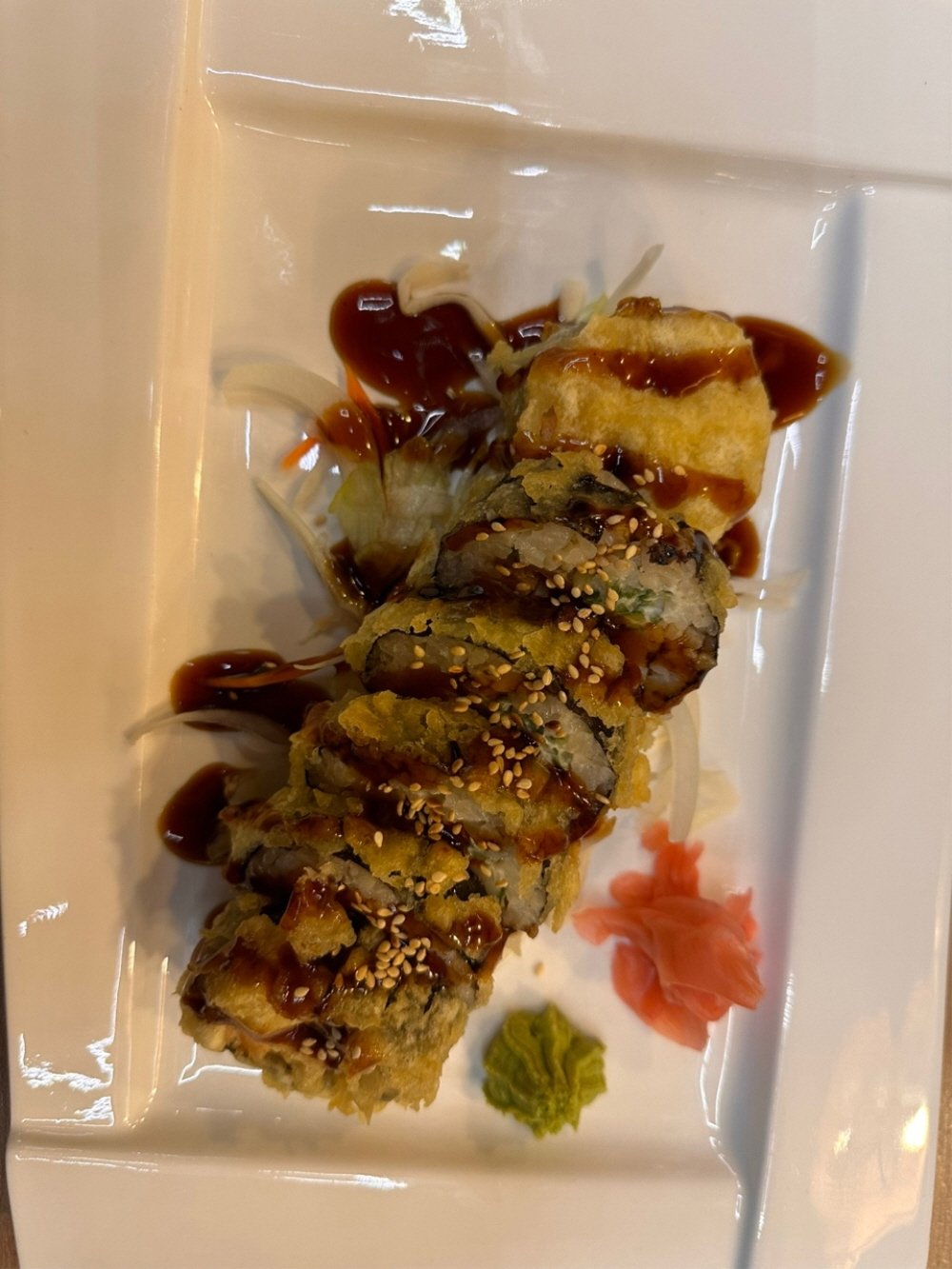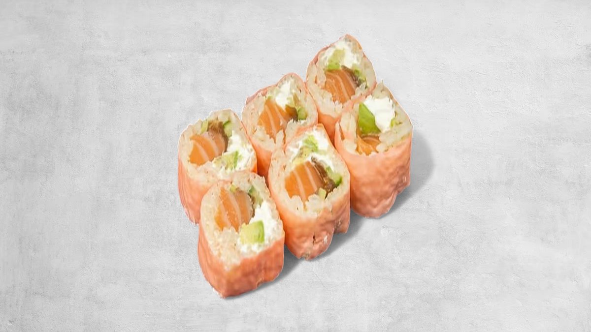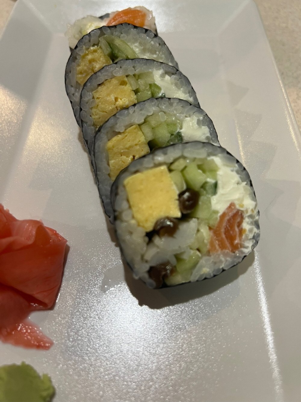 -Surowy łosoś, Serek kremowy, Tamago, Ogórek, Awokado, Marynowana rzodkiewka, Rolka smażona w panko -Raw Salmon, Cream Cheese, Tamago, Cucumber, Avokado, Pickled Radish, Roll Fried with Panko