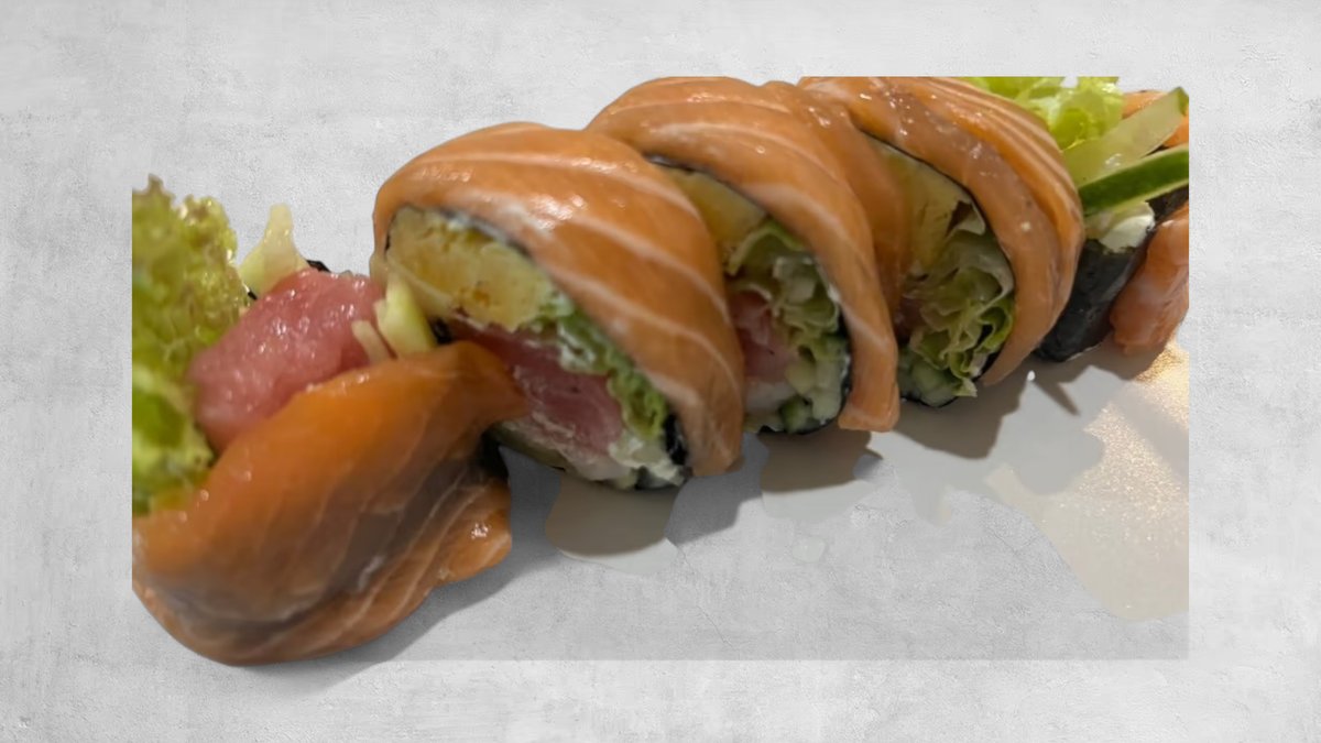 -Rolka bez ryżu, tuńczyk, krewetki, ogórek, awokado, sałata, serek kremowy, wszystko zawinięte w łososia -Without Rice, Tuna, Shirmp, Cucumber, Avokado, Lettuce, Cream Cheese, All wrapped in Salmon
