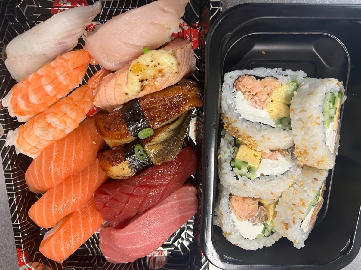 -12 Nigiri (do wyboru łosoś, tuńczyk, biała ryba lub krewetka) , 5 philadelpia roll (Pieczony lub surowy łosoś, Awokado, Ogórek, Tamago, Serek kremowy) -12 Nigiri (To choose from salmon, tuna, white fish or shrimp), 5 philadelpia roll (Baked or Raw Salmon, Avokado, Cucumber, Tamago, Cream Cheese)
