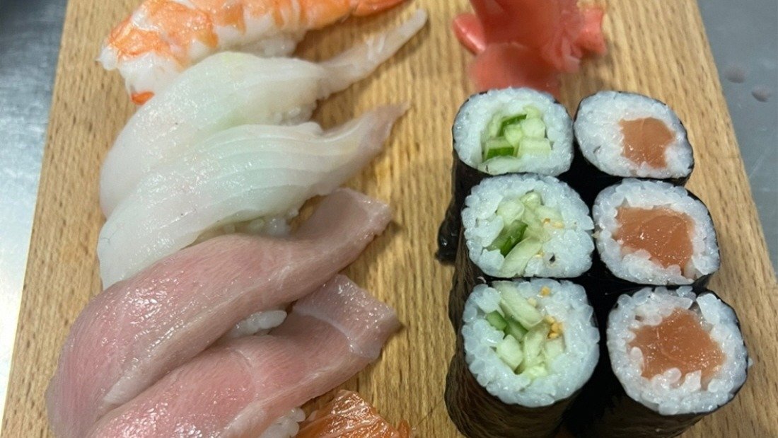 -7 Nigiri (3 złososiem, 2 z tuńczykiem, 1 z białą ryba, 1 z krewetką), 3 Hosomaki Łosoś, 3 Hosomaki Ogórek -7 Nigiri (3 with salmon, 2 with tuna, 1 with white fish, 1 with shrimp), 3 Hosomaki Salmon, 3 Hosomaki Cucumber