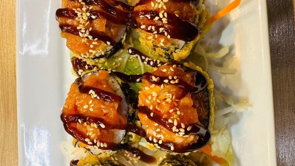 -tatar z łososia, ogórek, tamago, rolka smażona, tatar z łososia na wierzchu -Salmon Tatar, Cucumber, tamago, Fried Roll, Salmon Tatar on top