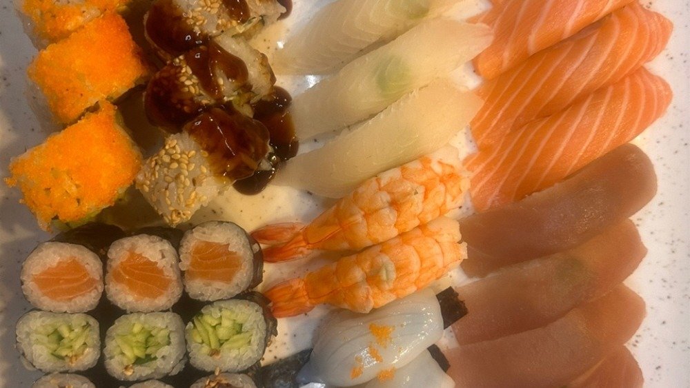 -20 Nigiri (do wyboru łosoś, tuńczyk, biała ryba lub krewetka), 6 Hosomaki (3 z łososiem, 3 z ogórkiem), 4 Califonia Sake (Surowy łosoś, Awokado, Surimi, Ogórek, Serek kremowy), 5 Philadelphia Roll (Pieczony lub surowy łosoś, Awokado, Ogórek, Tamago, Serek kremowy), 5 Sake Futo Maki (Surowy łosoś, ogorek, serek kremowy, surimi, tamago, tykwa kanpyo), 4 Ebi Tempura Roll (Krewetka w tempurze, ogórek, majonez) -20 Nigiri (To choose from salmon, tuna, white fish or shrimp), 6 Hosomaki (3 with salmon, 3 with cucumber), 4 Califonia Sake (Raw Salmon, Avokado, Surimi, Cucumber, Cream Cheese), 5 Philadelphia Roll (Baked or Raw Salmon, Avokado, Cucumber, Tamago, Cream Cheese), 5 Sake Futo Maki(Raw salmon, cucumber, cream cheese, surimi, tamago, kanpyo), 4 Ebi Tempura Roll (Shrimp tempura, cucumber, mayo)