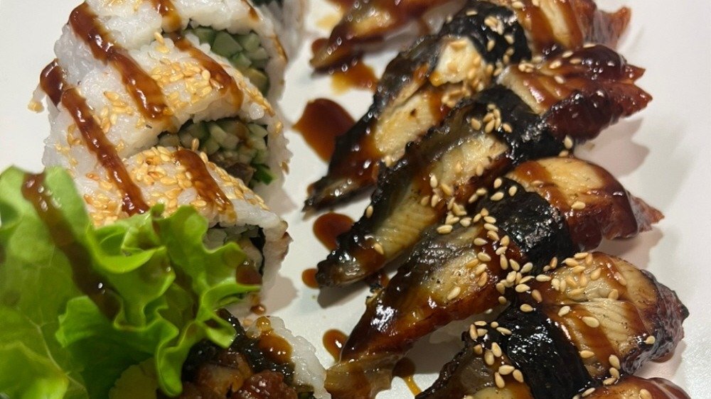 -6 Nigiri (węgorz słodkowodny), 8 California Unagi (Grilowany wegorz słodkowodny, Ogórek, Tamago, Sałata, Awokado, Serek kremowy) -6 Nigiri (Unagi), 8 Califonia Unagi (Grilled Unagi, Cucumber, Tamago, Lettuce, Avokado, Cream Cheese)