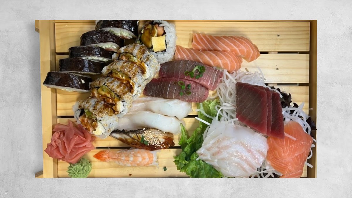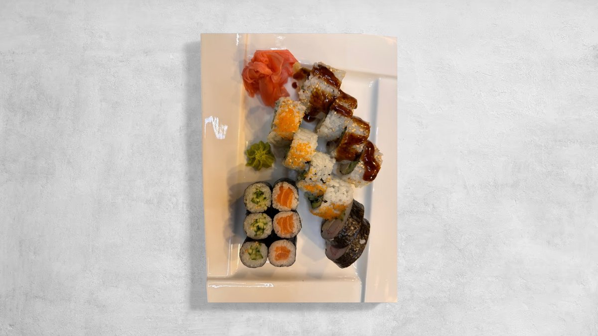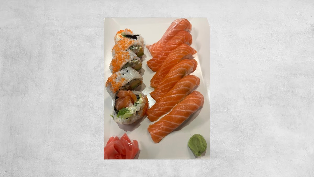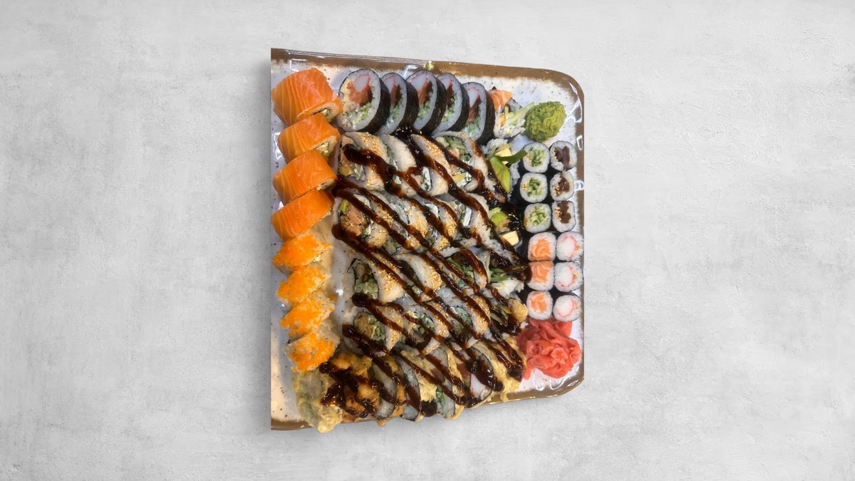 -8 Nigiri (do wyboru łosoś, tuńczyk, biała ryba lub krewetka), 12 Sashimi (4 surowy łosoś, 4 surowy tuńczyk, 4 surowa biała ryba), 5 Philadelphia Roll (Pieczony lub surowy łosoś, Awokado, Ogórek, Tamago, Serek kremowy), 5 Sake Futo Maki (Surowy łosoś, ogorek, serek kremowy, surimi, tamago, tykwa kanpyo)