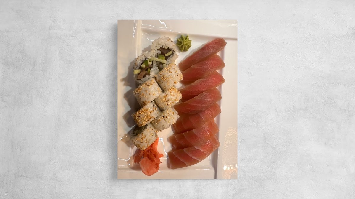 -6 Nigiri (tuńczyk), 8 Califonia Tuna (Surowy tuńczyk, Awokado, Surimi, Ogórek, Serek kremowy) -6 Nigiri (tuna), 8 Califonia Tuna (Raw Tuna, Avokado, Surimi, Cucumber, Cream Cheese)