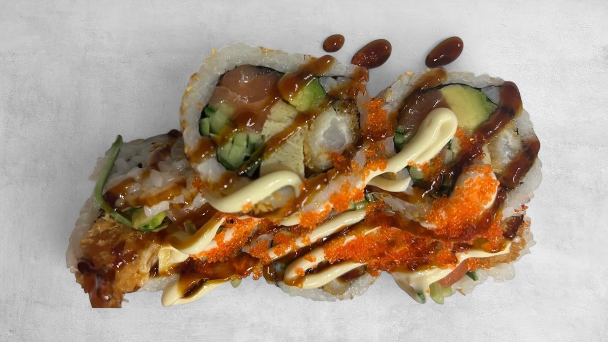 Wybrana ryba (Surowy lub pieczony łosoś, tuńczyk, węgorz słodkowodny, krewetka w tempurze), awokado, tamago, ogórek, majonez -Chosen Fish ( Raw Salmon or Baked Salmon , Tuna, Shrimp Tempura, Unagi), avokado, Tamago, Cucumber, Mayo