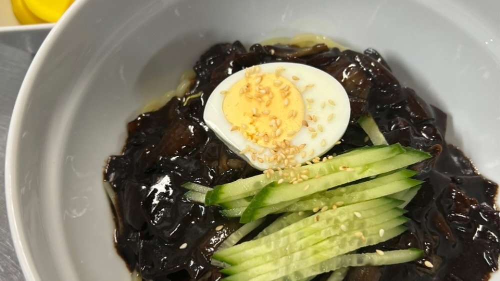 -Pszeniczny makaron z sosem z pasty z czarnej fasoli i kawałkami wieprzowiny oraz warzywami -Wheat noodles with black bean paste sauce, pieces of pork and vegetables