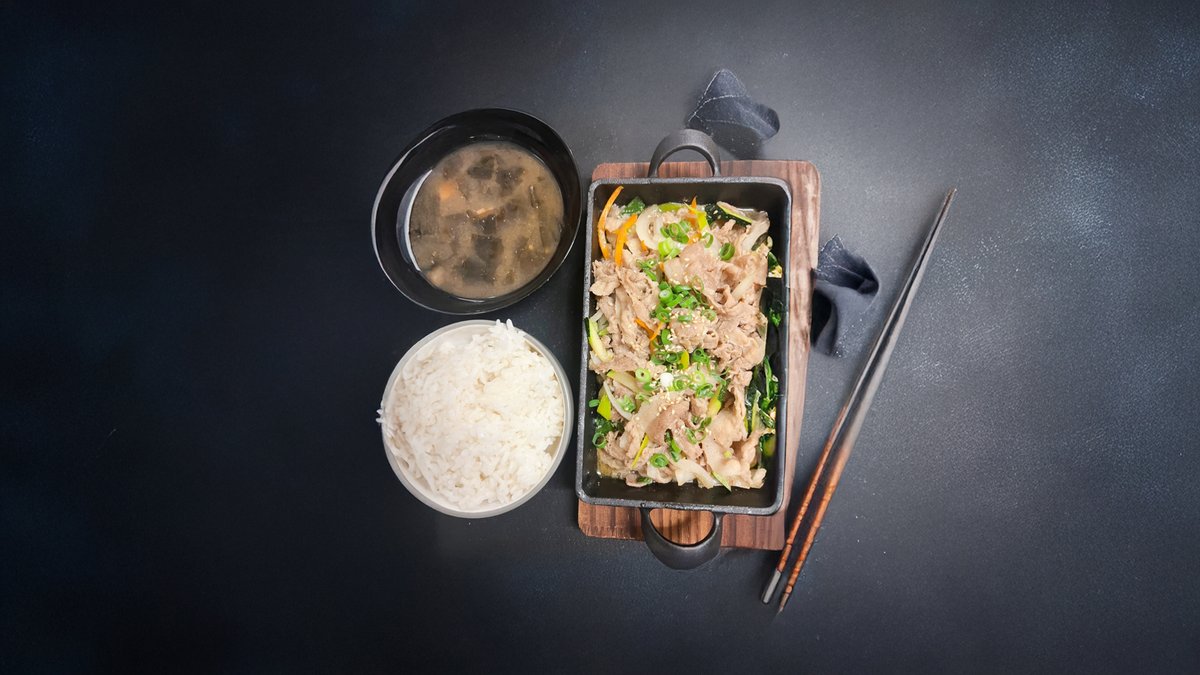 wieprzowina marynowana w sosie sojowym i grillowana, podawana z ryżem. Pork marinated in soy sauce and grilled, served with rice