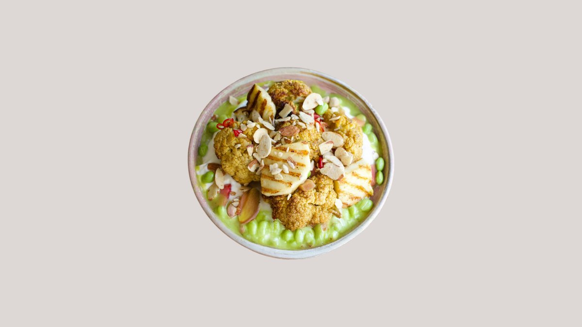 kalafior~ halloumi z Bobrownik ~ marynowana czerwona cebula ~ kwaśna śmietana ~ miód z chilli ~ prażone płatki migdałów ~ pędy groszku