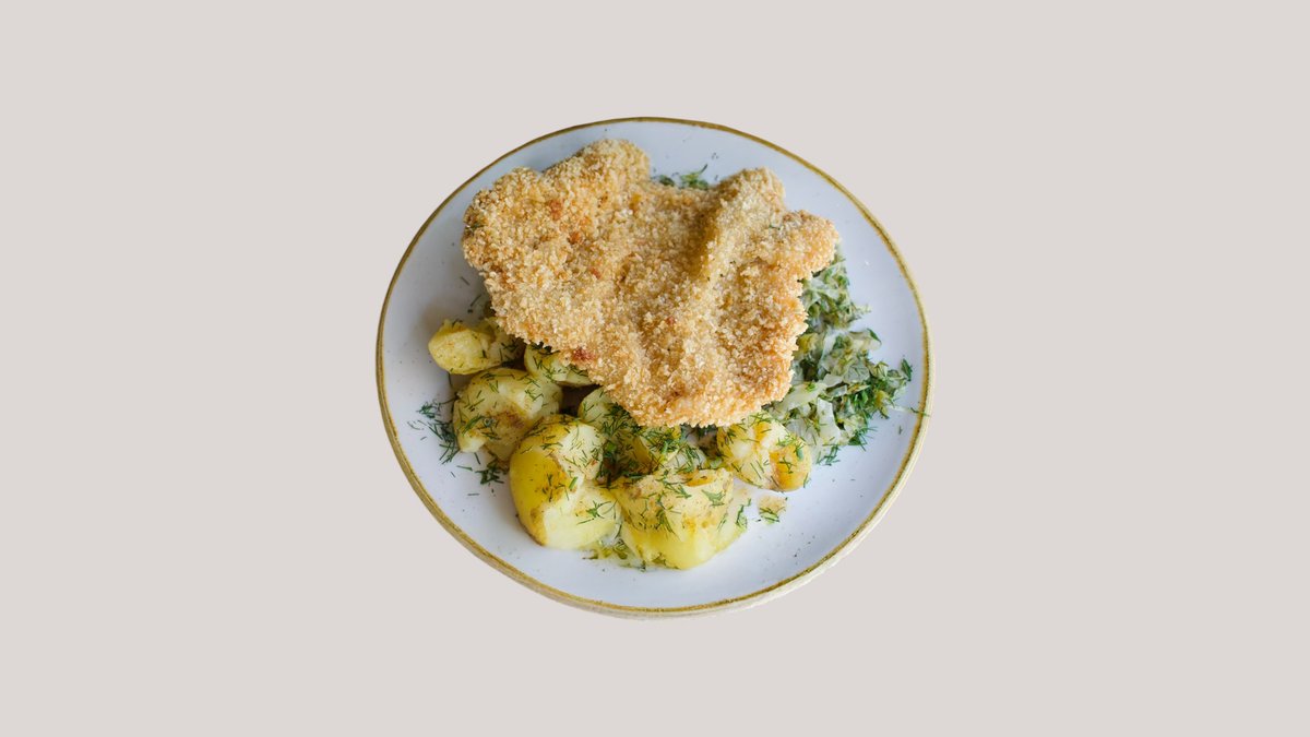 schab wieprzowy z małych gospodarstw z Wielkopolski, panierowany w panko ~ młode ziemniaki ~ colesław z majonezem sriracha