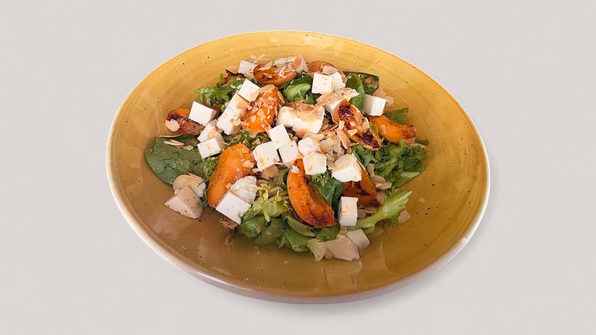 sałaty ~ ser z niebieską pleśnią ze Ślesina ~ flambirowana gruszka z kardamonem i rumem ~ czerwona cebula ~ dressing cytrynowo - bazyliowy ~ nuta papryczki chipotle ~ chrupka migdałowa ~ chipsy chlebowe