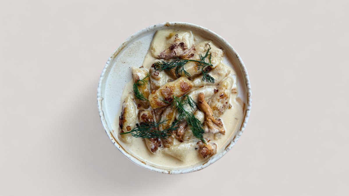domowe kopytka ~ sos z roślinnej śmietanki z leśnymi grzybami ~ zielona oliwa ~ puder grzybowy ~ grubo mielony pieprz czarny i różowy
