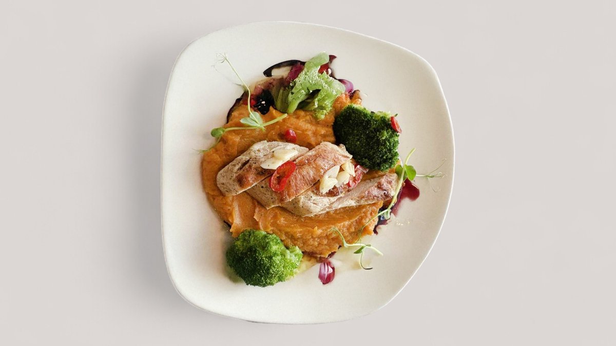 grillowany filet z kurczaka marynowany w cytrusach ~ puree z batata z palonym masłem ~ redukcja z czerwonego wina z rozmarynem ~ brokuł z czosnkiem
