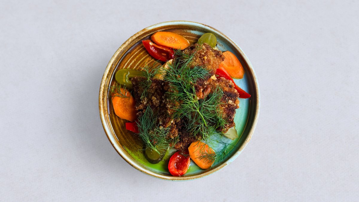 boczniaki w domowej panierce ~ sojonez sriracha ~ kiszony ogórek od Sznajdra ~ warzywa piklowane ~ koperek ~ zielona oliwa