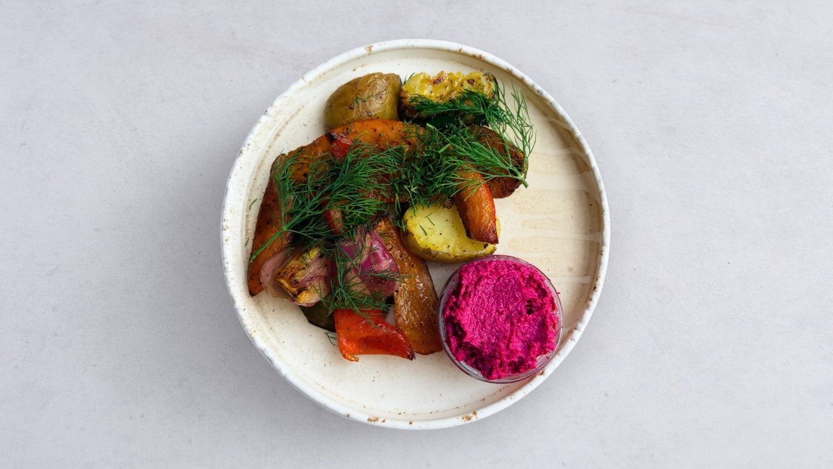 pieczone warzywa (papryka, cukinia, dynia, ziemniaki, czerwona cebula) ~ sezam ~ hummus buraczany ~ pędy groszku