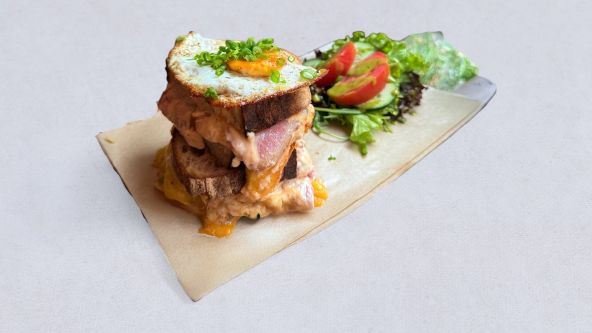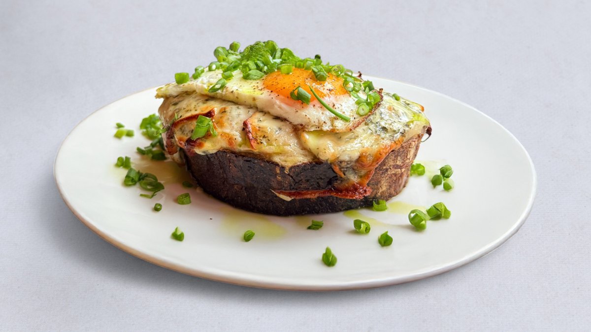 chleb wiejski na zakwasie z sosem beszamelowym ~ ser ze Ślesina ~ szynka wędzona z Felinowa ~ jajko sadzone z wolnego wybiegu ~ szczypior ~ oliwa zielona