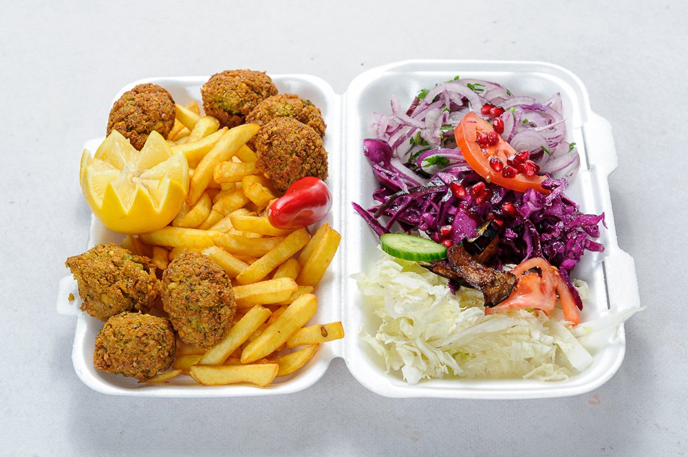 Falafel lub mięso, frytki, kapusta czerwona i pekińska, ogórki, pomidory, cebula, szpinak, rukola, sosy. Zdjęcie poglądowe