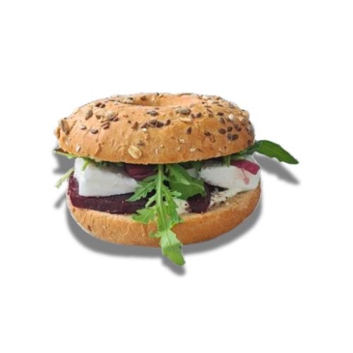 Bułka pszenna typu bajgel z pieczonymi burakami, analogiem sera camembert, sosem, karmelizowaną cebulą i rukolą