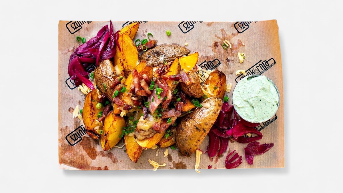 smażone ziemniaki w przyprawach / ser kaszar z Bobrownik / smażony boczek z lagi z Felinowa / sos twarożkowo-ziołowy / piklowana czerwona cebula z hibiskusem / szczypiorek
