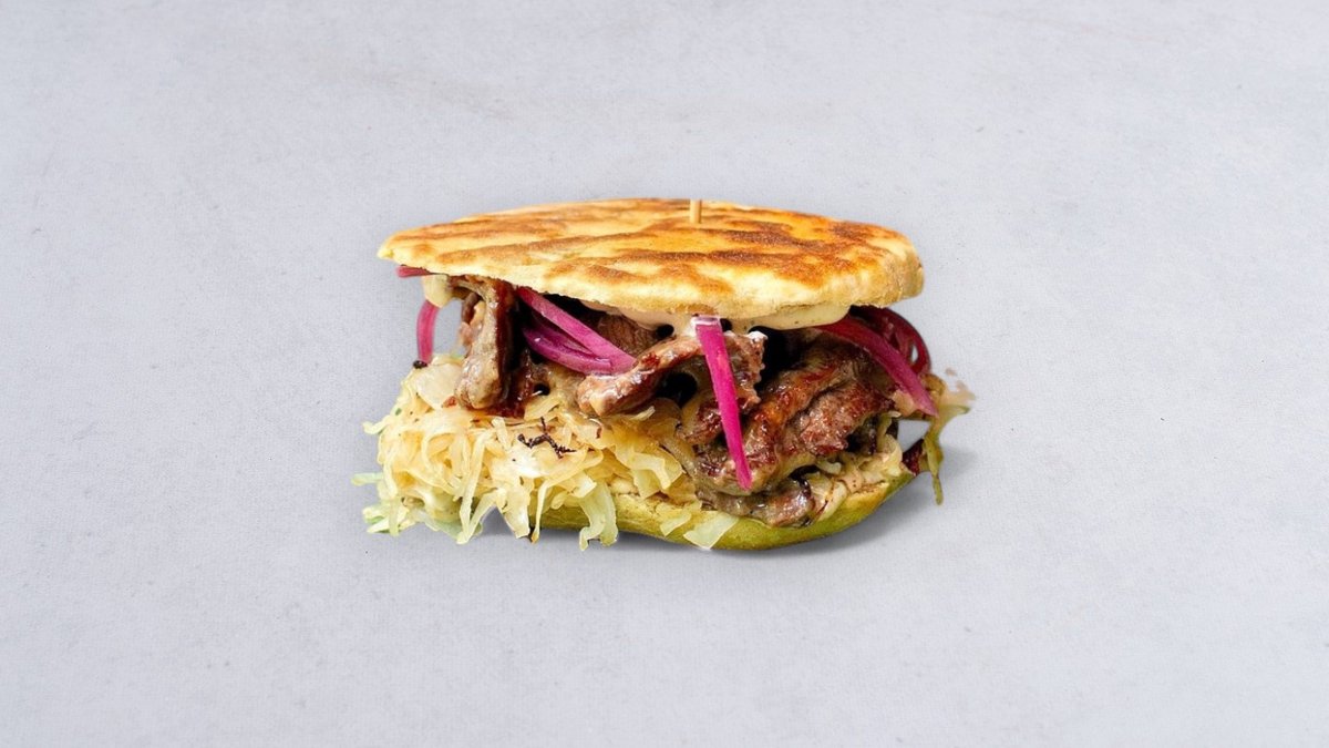 bułka proziak / siekany stek wołowy z polskiej wołowiny / tarty ser kaszar z Bobrownik / smażona kapusta kiszona od Sznajdera / sos majonezowo-musztardowy / piklowana czerwona cebula z hibiskusem