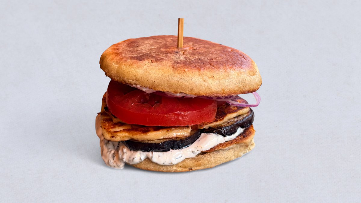 bułka proziak / grillowane halloumi z Bobrownik / smażony bakłażan / czerwona cebula / pomidor / sos śmietanowo-miętowy / orzechy włoskie