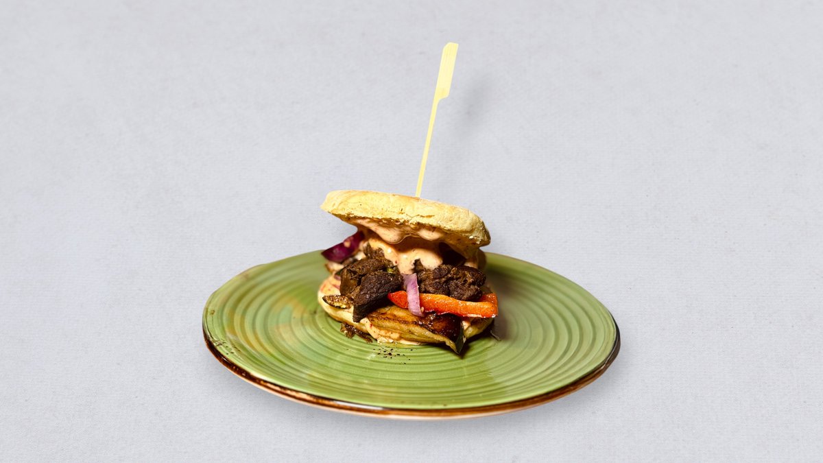 bułka proziak / małopolska baranina duszona z suską sechlońską / sos majonezowo - musztardowy / harissa / grillowane warzywa / natka pietruszki