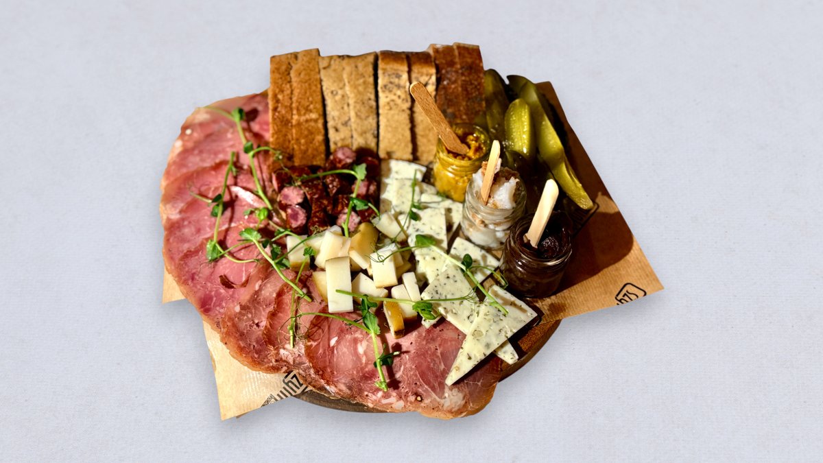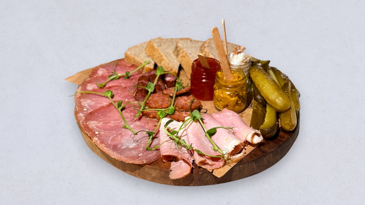 1. Kindziuk Podlaski z Ancypo 2. Szynka z Lagi z Felinowa 3. Kiełbasa Węgierska z Dukli 4. Kabanos Wieprzowy z Felinowa 5. Kiełbasa Myśliwska z Dzika z Leśniczówki Gościejowice 6. Szynka Surowo Dojrzewająca z Dukli 240g produktów. Podawana z żytnim chlebem własnego wypieku / ogórkami kiszonymi od Sznajdera / chrzanem z miodem i kurkumą / domowym smalcem / konfiturą z jabłka i habanero