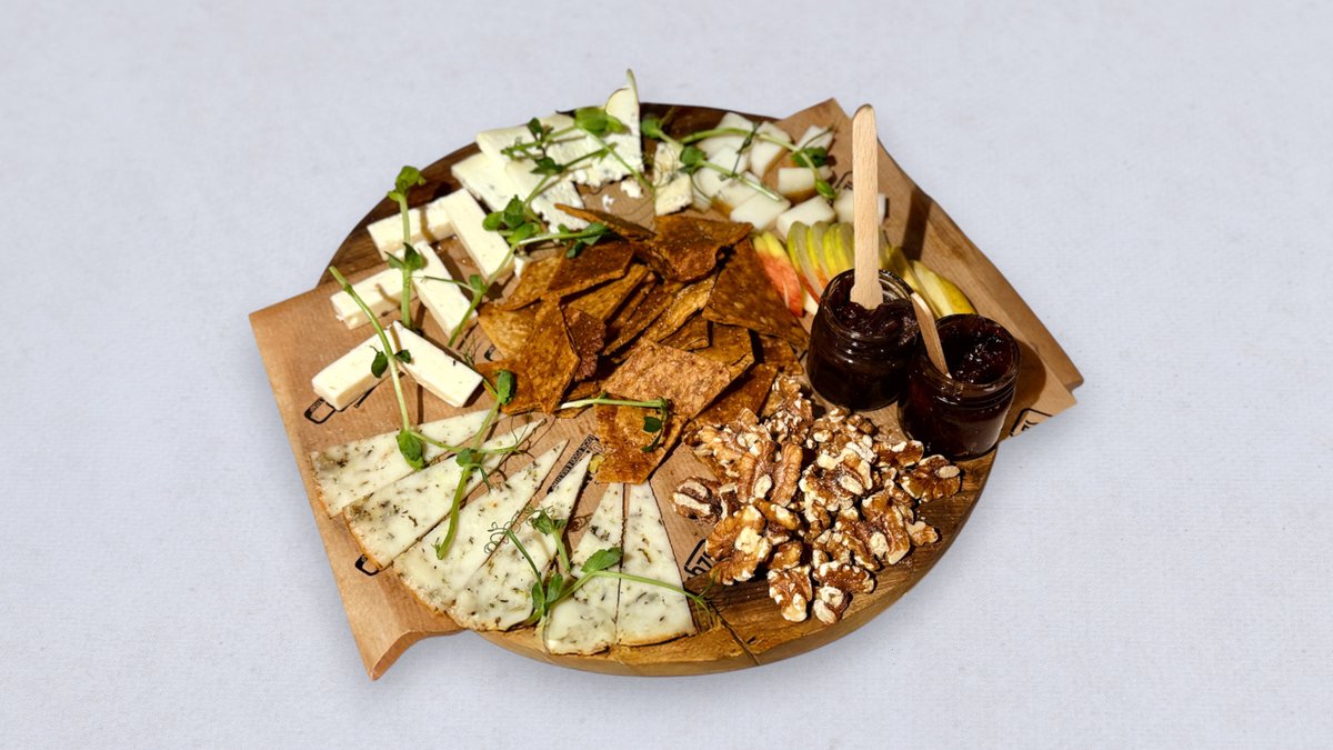 1. Wędzona Kozia Gouda z Farmy Złotnej 2. Starszak Ślesiński 3. Feta Yusufa z Bobrownik 4. Szlachcic Ślesiński 5. Ser Owczy Dojrzewający od Nizio Naturals 6. Ser Kozi Dojrzewający z płatkami kwiatów z Farmy Złotnej 240g produktów . Podawana z domowymi nachosami / domową konfiturą z czerwonej cebuli / chutney buraczanym / orzechami włoskimi / jabłkiem