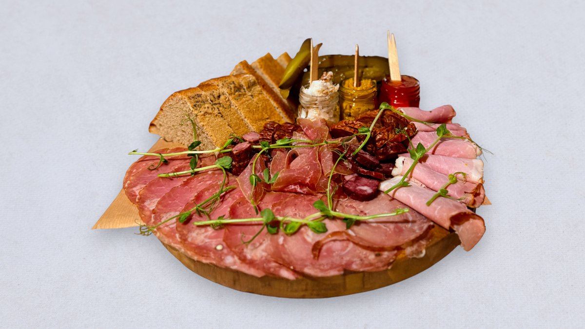 1. Kindziuk Podlaski z Ancypo 2. Szynka z Lagi z Felinowa 3. Kiełbasa Węgierska z Dukli 4. Kabanos Wieprzowy z Felinowa 120g produktów. Podawana z żytnim chlebem własnego wypieku / ogórkami kiszonymi od Sznajdera / chrzanem z miodem i kurkumą / domowym smalcem / konfiturą z jabłka i habanero