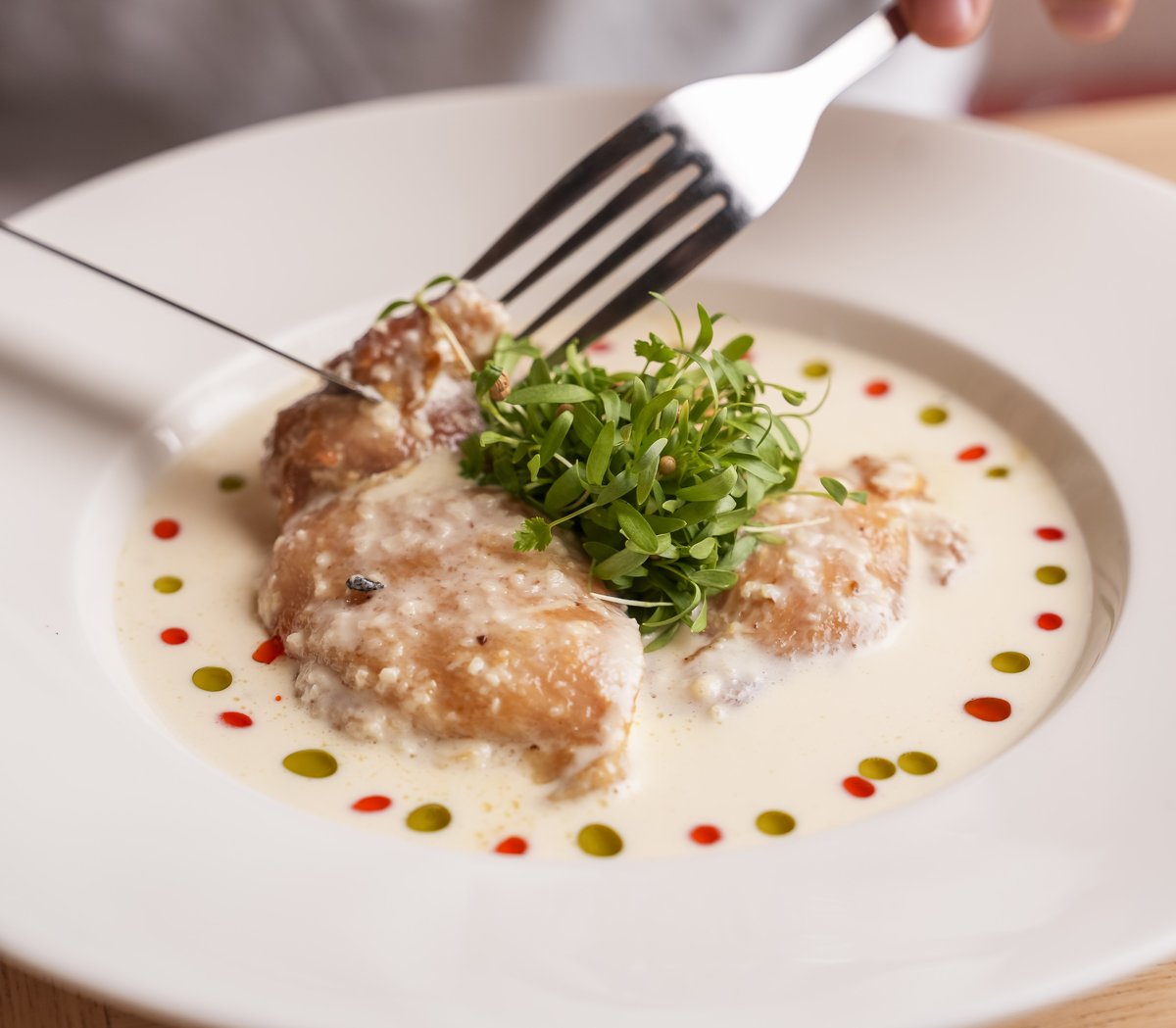 smażone kawałki kurczaka w sosie śmietankowo-czosnkowym z aromatyczną oliwą i świeżymi ziołami . Podawane z pieczywem