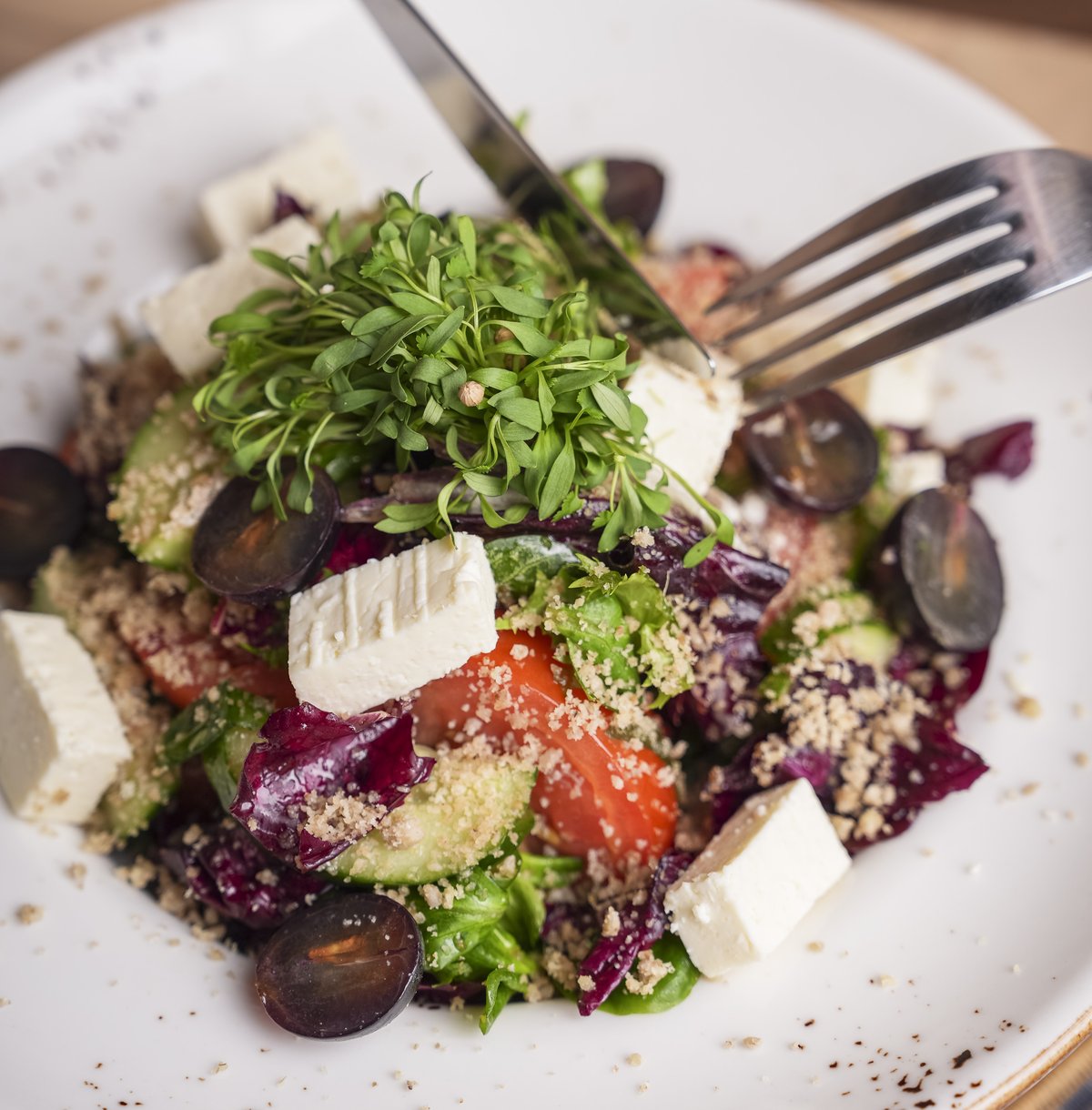 Pomidor, ogórek, czerwona cebula, mix sałat, ser gruziński, winogrono, orzechy włoskie, mikro kolendra, dressing miodowo musztardowy