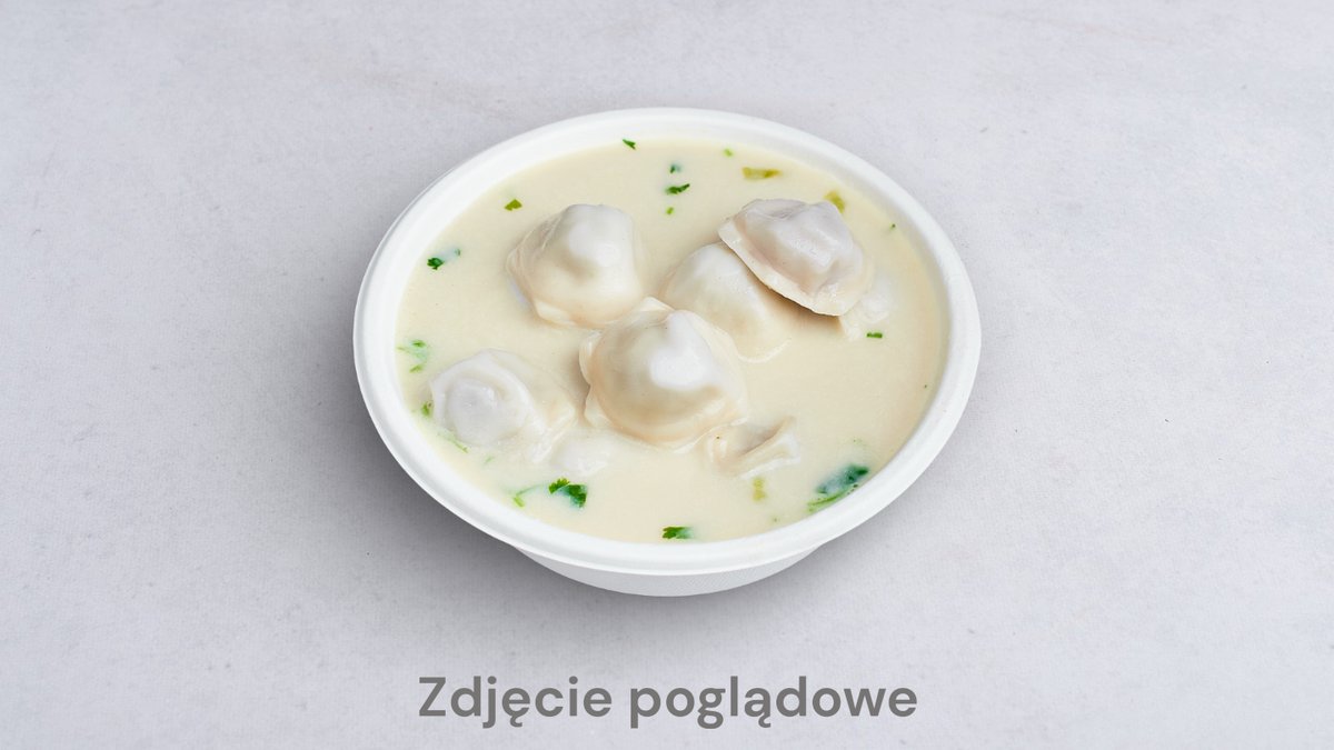 zupa z pierożkami wieprzowo-wołowymi koperkiem, czosnkiem i śmietaną. Zapiekana pod chlebem