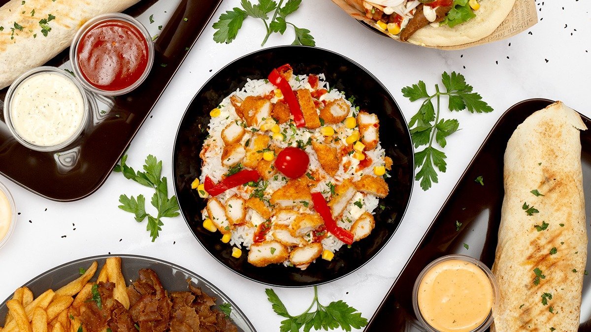 Mięso, sos, surówki, ogórek, pomidor, sałata lodowa, cebula