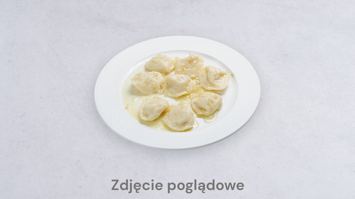 Ręcznie lepione pierogi ruskie (8 szt.) okraszane cebulką, podawane w towarzystwie kwaśnej śmietany. Farsz: twaróg, ziemniaki, cebulka, pieprz i sól