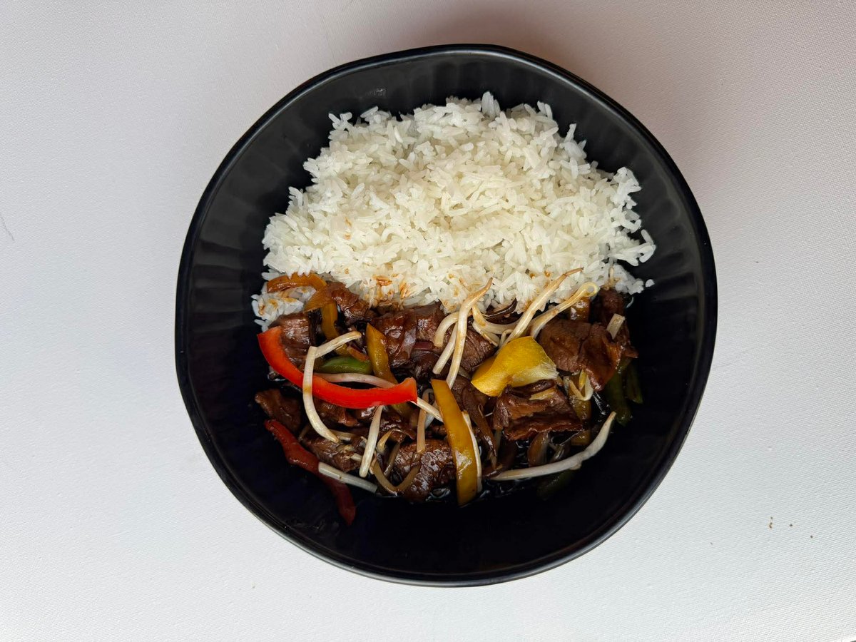 Sos teriyaki / ryż jaśminowy / wołowina / grzyby mun, kiełki, cebula, papryka